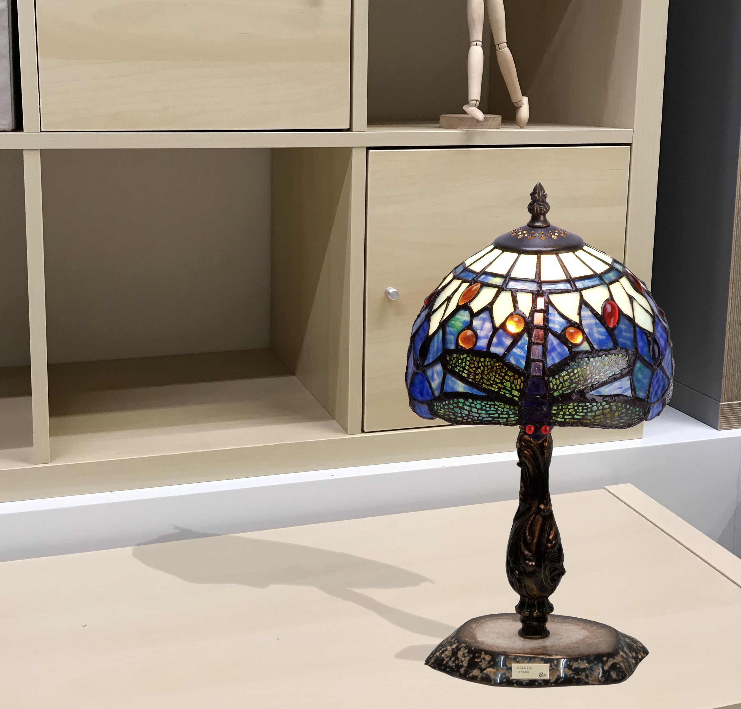Clásicas libélulas de tonos azules en pantalla estilo Tiffany con base en piedra semi-preciosa agata neutra con certificado de reproducción del original numerado y montura para sobremesa. ATENCIÓN la piedra agata varia de la fotografía, son auténticas y siempre distintas aunque parecidas a la muestra de la foto. Ref.1997.75* D.20cm