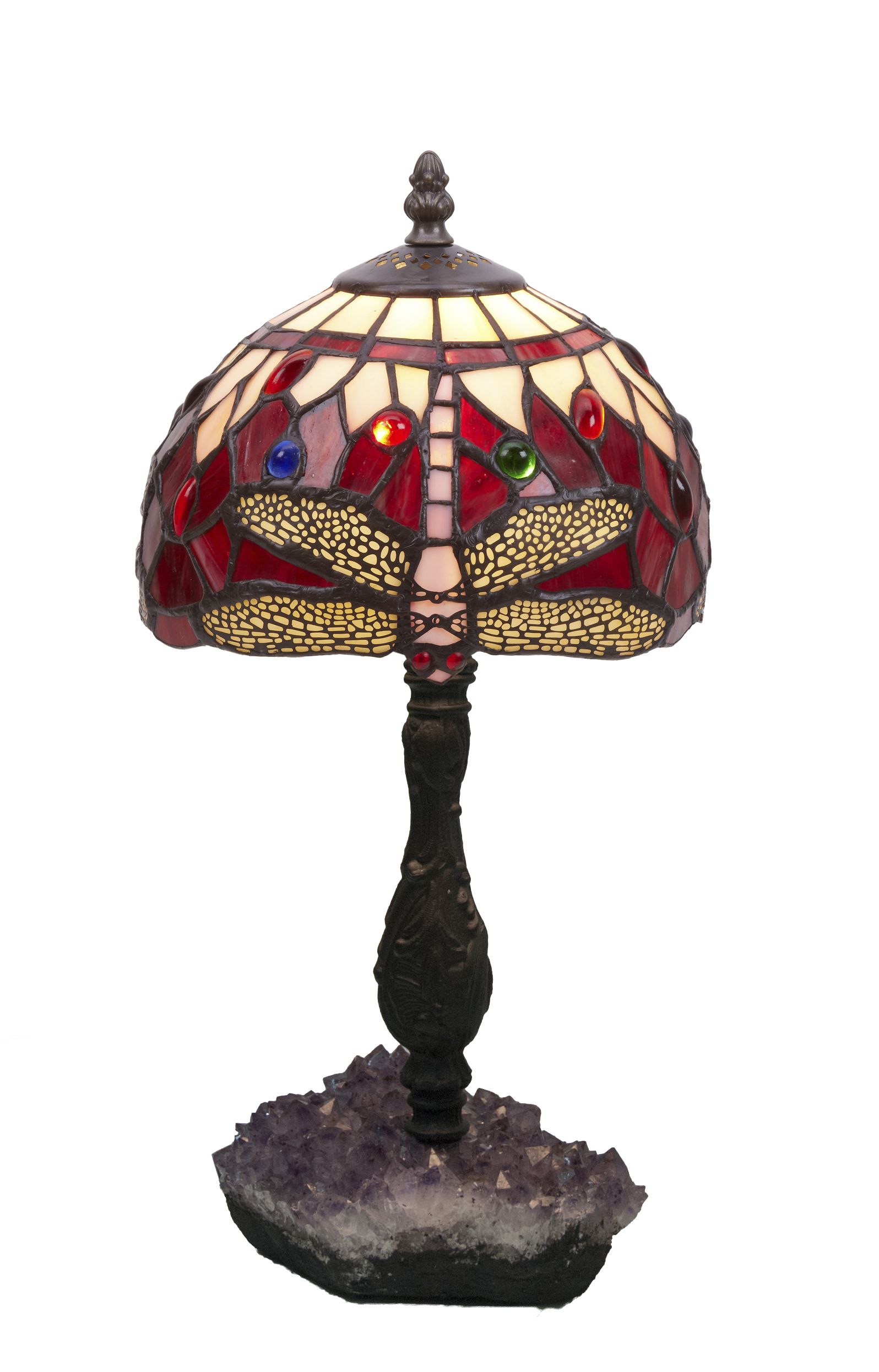 Clásicas libélulas de tonos rojos en pantalla estilo Tiffany con base en piedra semi-preciosa amatista con certificado de reproducción del original numerado y montura para sobremesa. ATENCIÓN la piedra agata varia de la fotografía, son auténticas y siempre distintas aunque parecidas a la muestra de la foto. Ref.1994.79* D.20cm