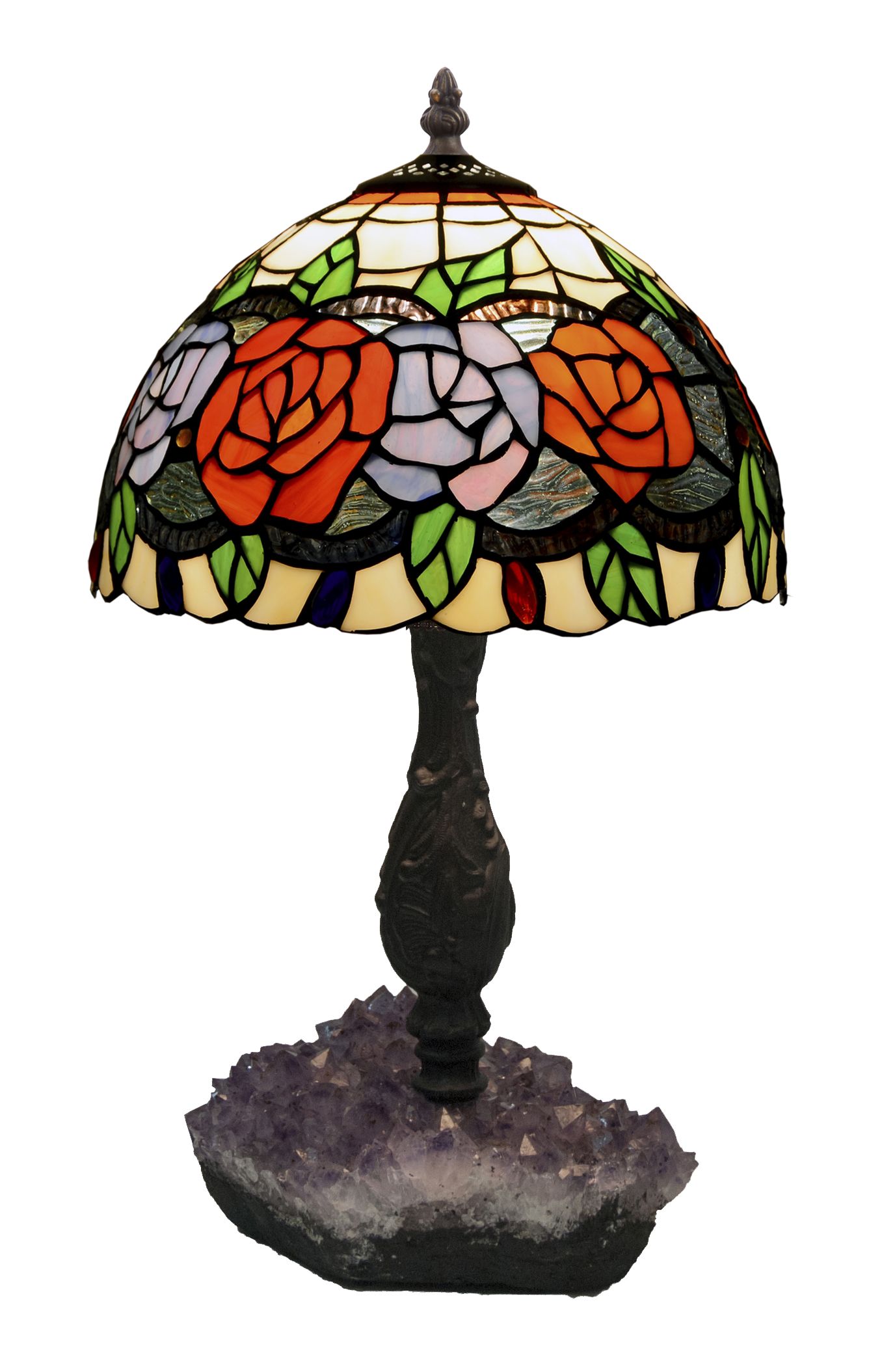 Clásicas pantalla estilo Tiffany con tema floral con base en piedra semi-preciosa amatista con certificado de reproducción del original numerado y montura para sobremesa. ATENCIÓN la piedra amatista varia de la fotografía, son auténticas y siempre distintas aunque parecidas a la muestra de la foto. Ref.2838.79* D.20cm