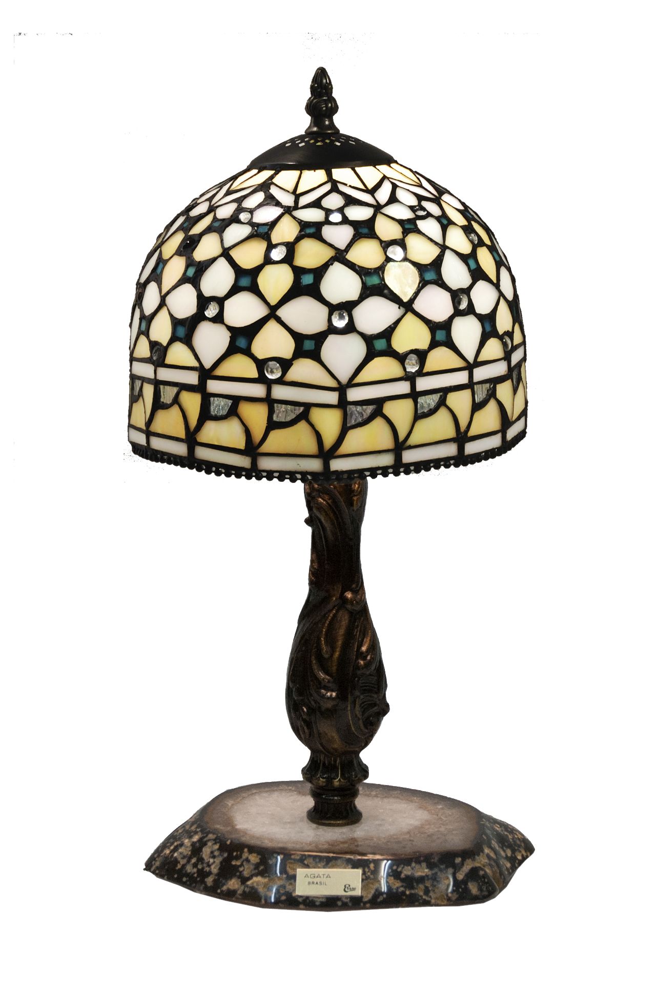 Clásica pantalla estilo Tiffany con base en piedra semi-preciosa agata neutra con certificado de reproducción del original numerado y montura para sobremesa. ATENCIÓN la piedra agata varia de la fotografía, son auténticas y siempre distintas aunque parecidas a la muestra de la foto. Ref.2138.75* D.20cm