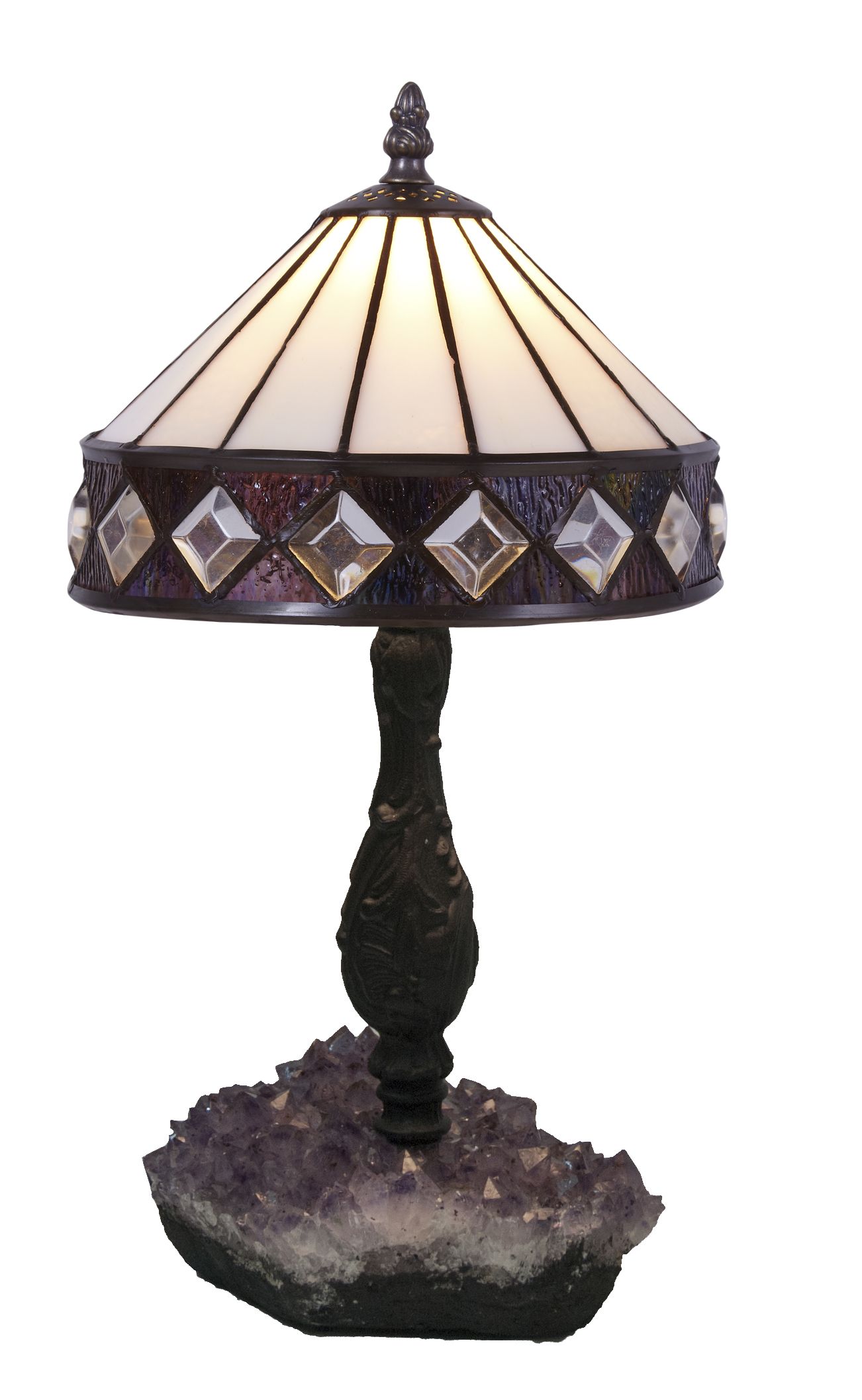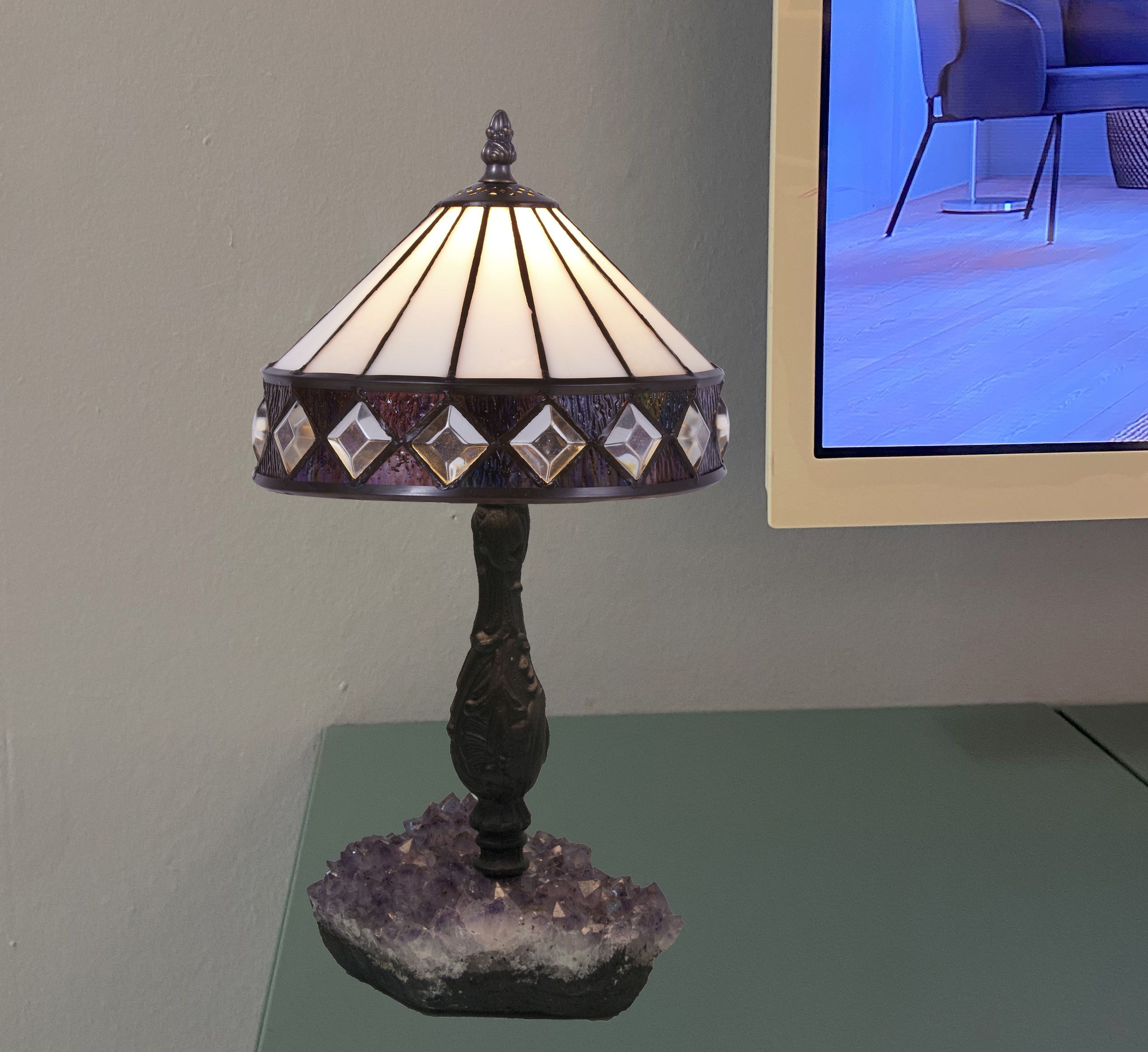 Pantalla estilo Tiffany con base en piedra semi-preciosa amatista con certificado de reproducción del original numerado y montura para sobremesa. ATENCIÓN la piedra agata varia de la fotografía, son auténticas y siempre distintas aunque parecidas a la muestra de la foto. Ref.2908.79* D.20cm