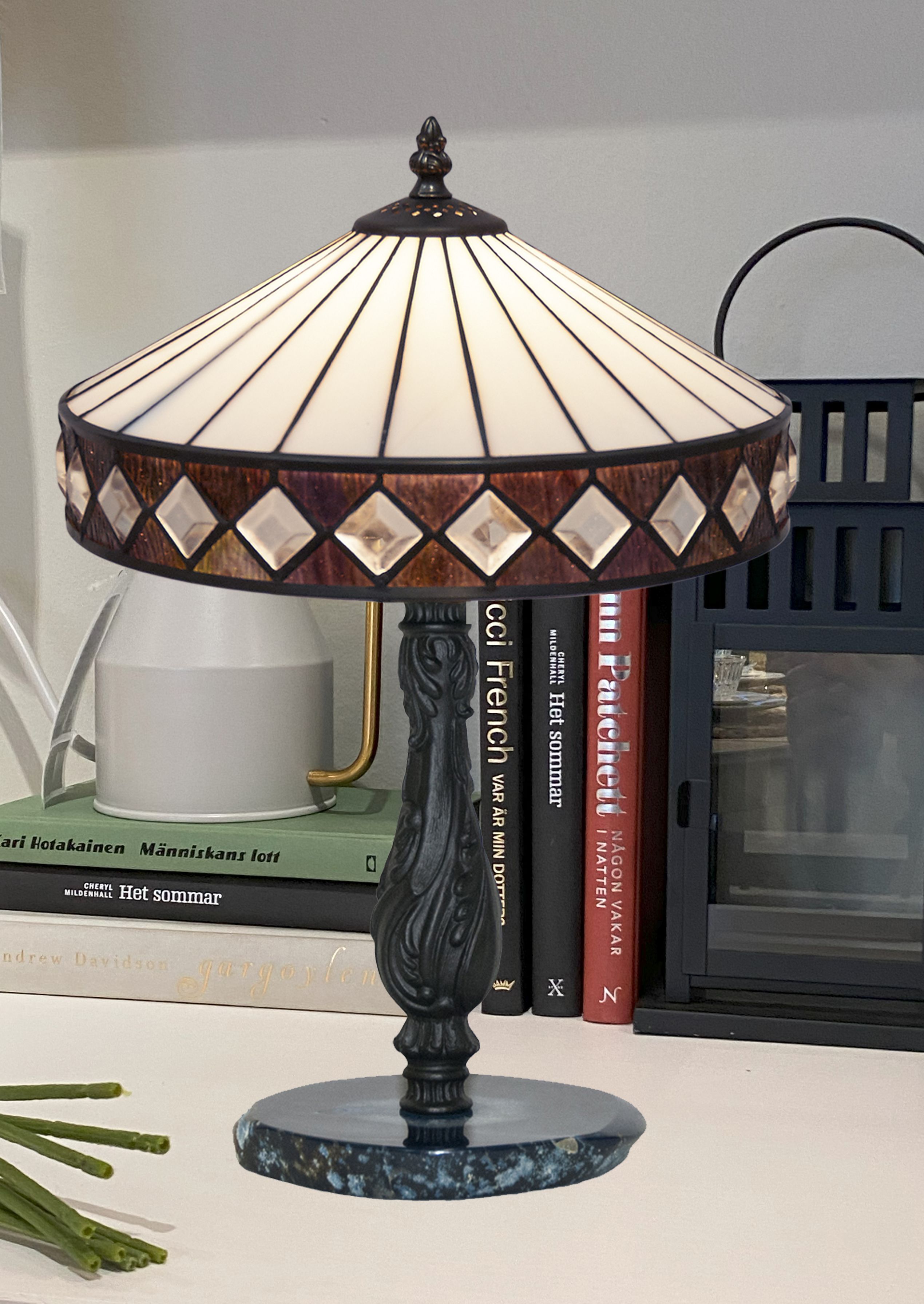 Clásicas pantalla estilo Tiffany con base en piedra semi-preciosa agata azul con certificado de reproducción del original numerado y montura para sobremesa. ATENCIÓN la piedra agata varia de la fotografía, son auténticas y siempre distintas aunque parecidas a la muestra de la foto. Ref.2906.64* D.30cm