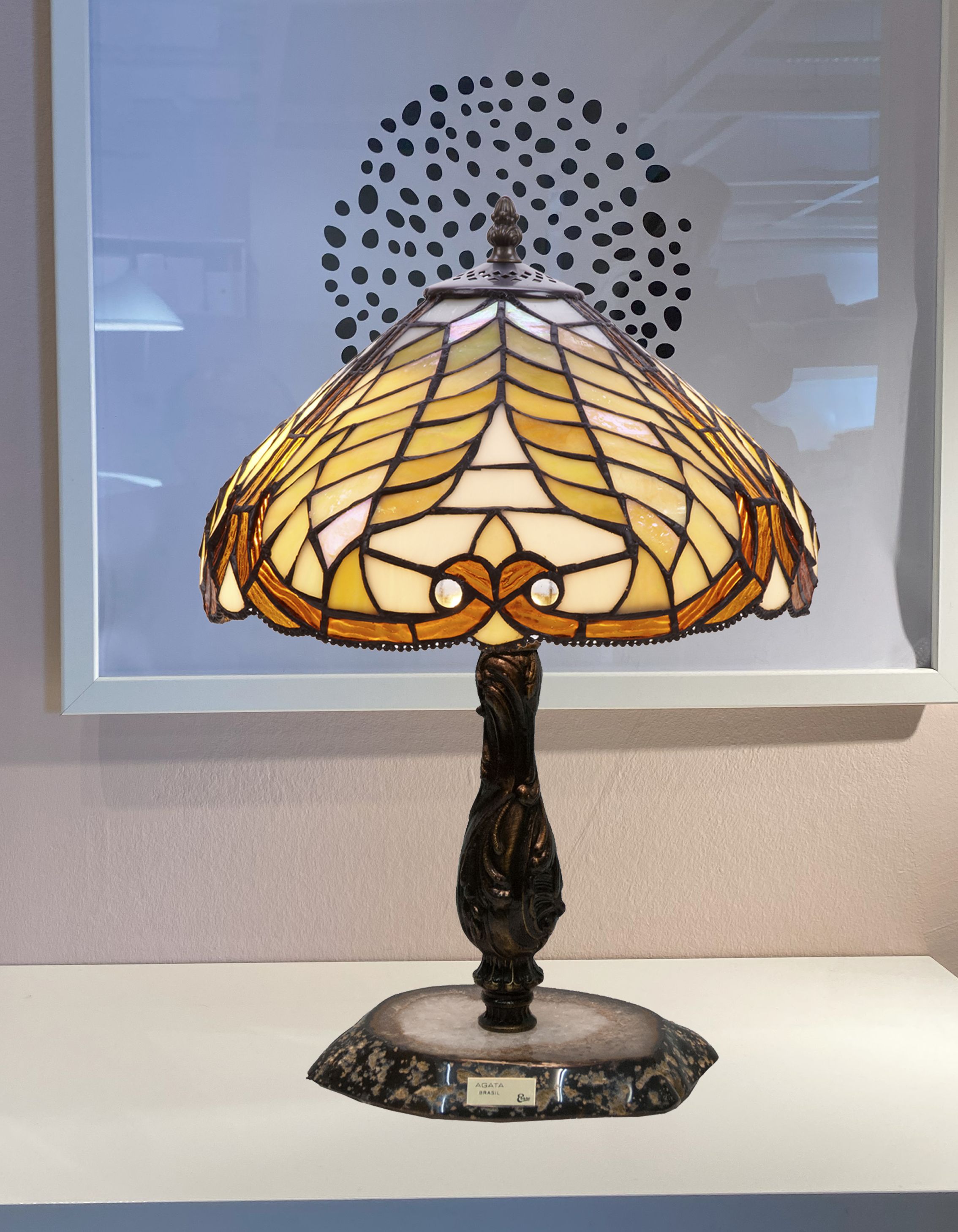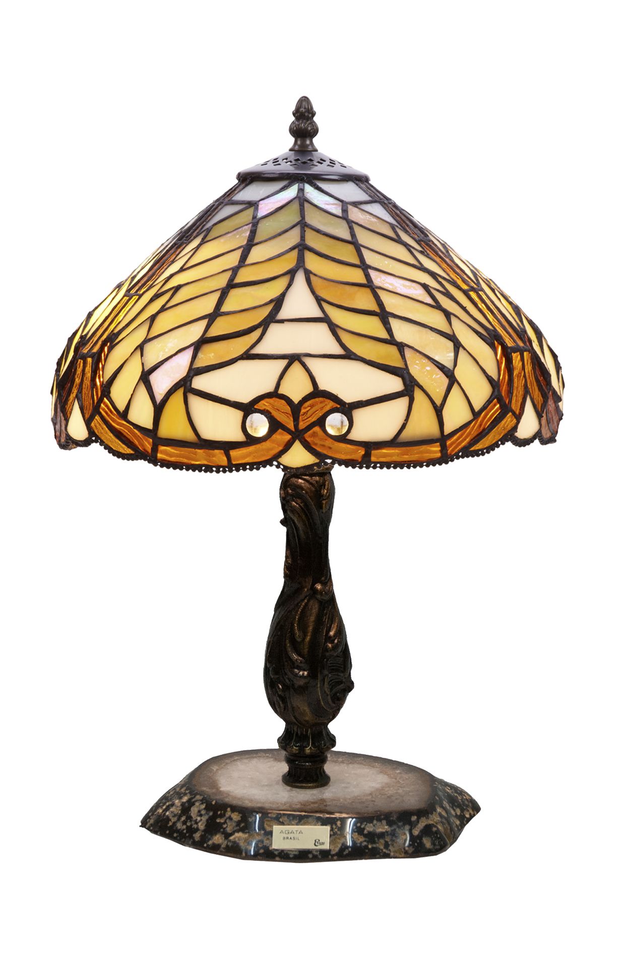 Clásicas pantalla estilo Tiffany con base en piedra semi-preciosa agata neutra con certificado de reproducción del original numerado y montura para sobremesa. ATENCIÓN la piedra agata varia de la fotografía, son auténticas y siempre distintas aunque parecidas a la muestra de la foto. Ref.2386.65* D.30cm