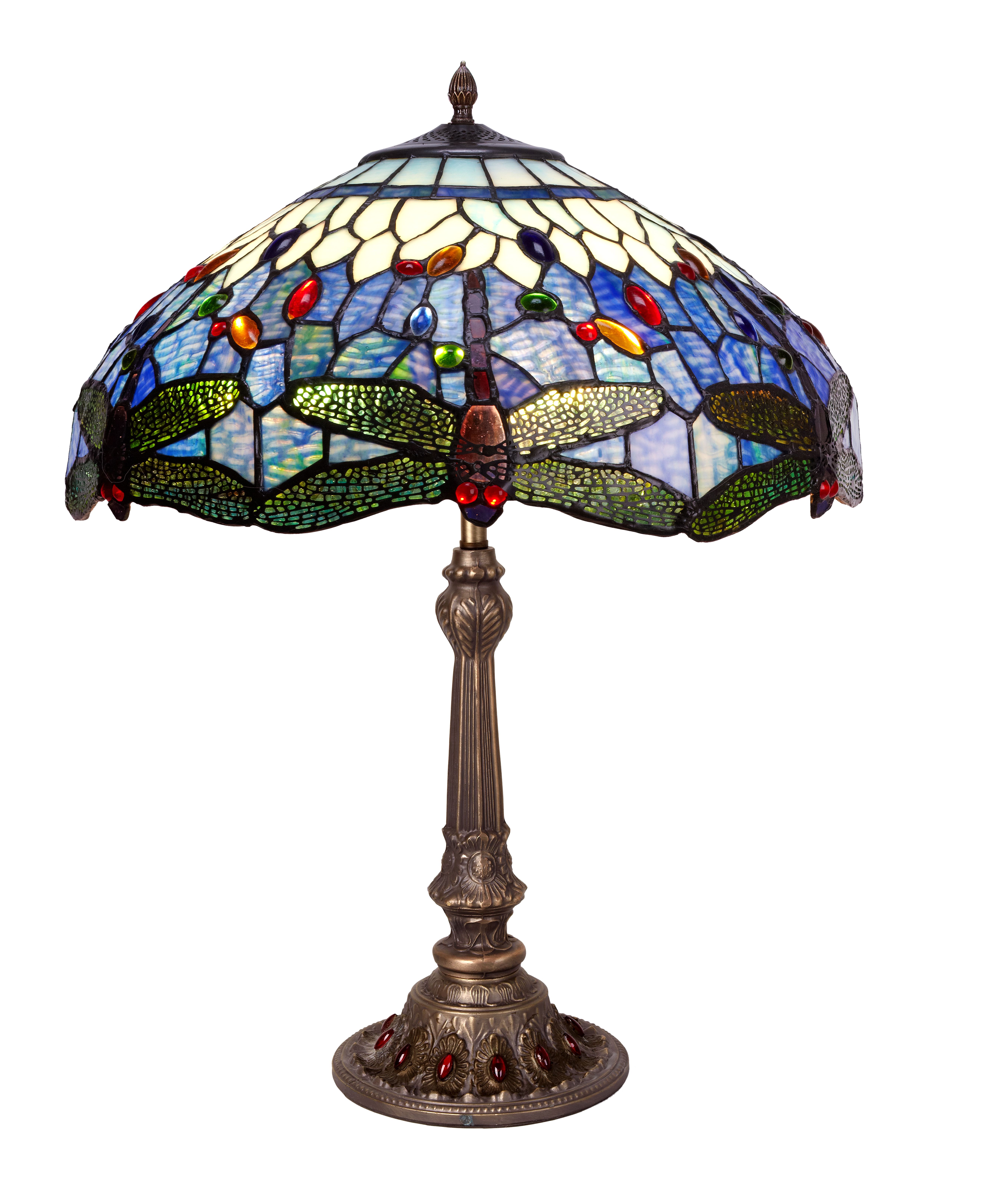 Ref.1970.22 D.54cm Clásicas libélulas en pantalla estilo Tiffany azul con certificado de reproducción del original numerado y montura para gran sobremesa.